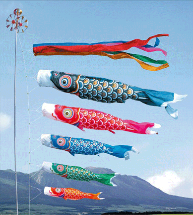 el día del niño, izan ñas banderas o encima del tejado o jardín en las casas que hay hijos, como símbolo de protección para los hijos y prosperidad de ellos. El niño simboliza la carpa, el poder que tiene como pez que lucha a contracorriente del rio.
