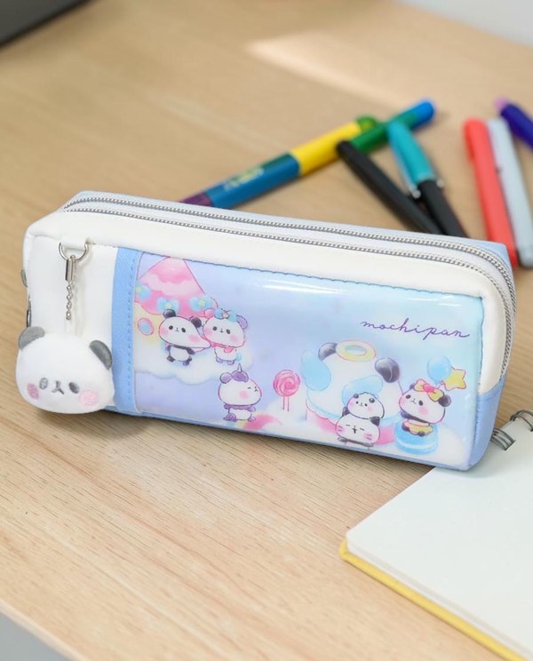 Estuche kawaii de Kamio Japan, con adorables pandas entre nubes y dulces. Diseño con doble cremallera para organizar mejor tu material escolar y un peluche panda de tirador