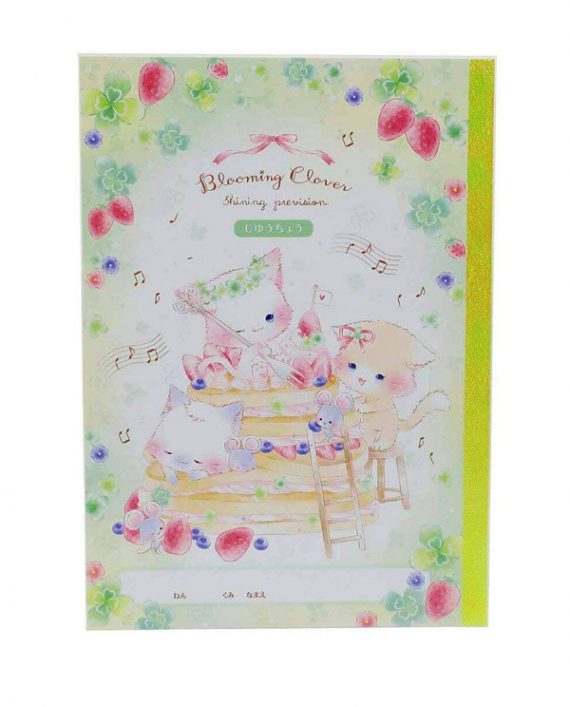 Libreta interior blanco “Blooming Clover” de la marca Kamio Japan. En la portada gatitos y ratones preparando pancakes en un bosque de treboles y fresas.
