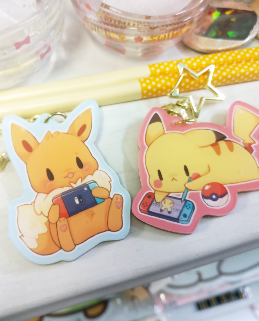 Llavero acrílico de doble cara con diseño de Pikachu y de Eevee ( Pokemon ) jugando a la switch. Cierre de estrella en dorado, aproximadamente 6cm más cierre.