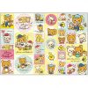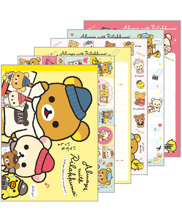 Memo pad grande de Rilakkuma del set “Always with Rilakkuma” . En la portada en color amarillo, Rilakkuma, Korilakkuma y Kiroitori vestidos con camisetas y gorritos a juego! En el interior, 100 hojas de 4 diseños diferentes y una lámina de pegatinas especial.