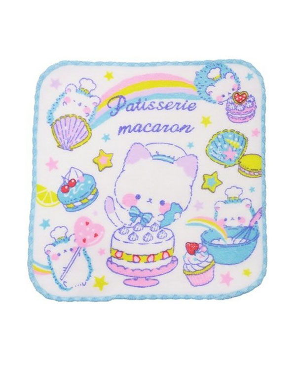 Mini toalla japonesa “Pastisserie Macaroon”, con dibujos de un gato y varios erizos preparando una tarta, todo en tonos pastel, de la marca Kamio.