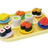 Colección Conveyor sushi ( sushi giratorio ) – con un montón de sushi de diferentes tipos en sus platitos, dos vasos con té y la base giratoria.