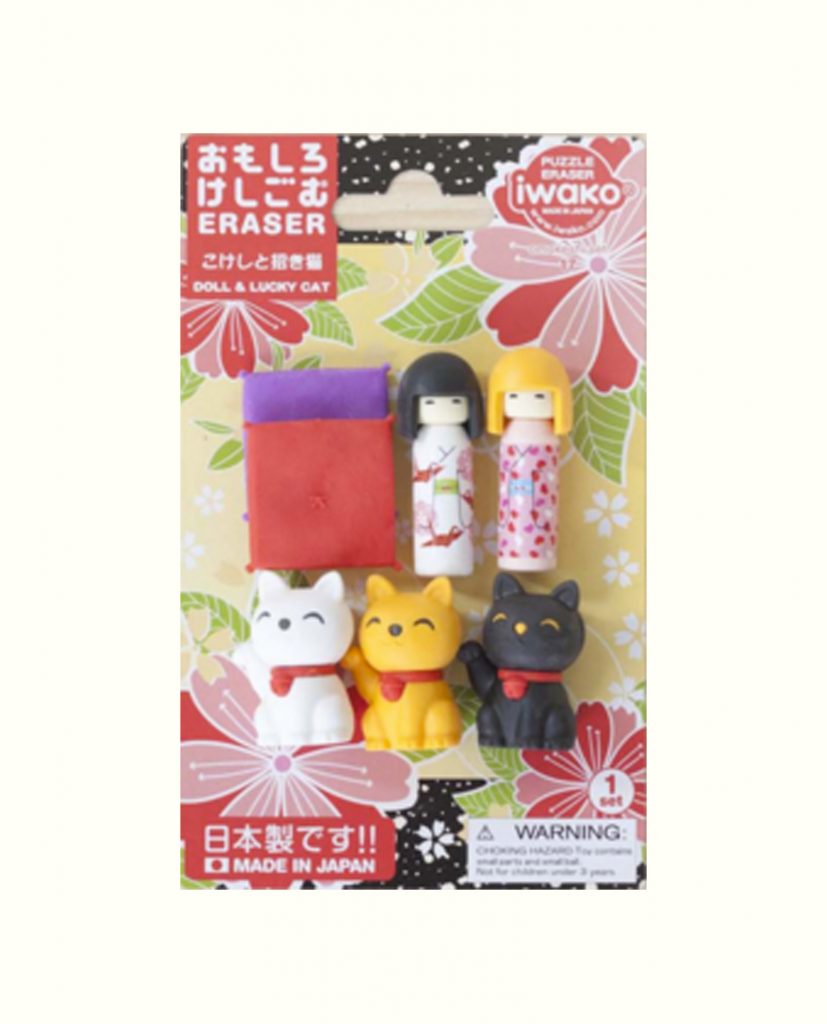 pack de gomas japonesas con forma marca IWAKO. Colección con manekinekos y kokeshis. Encuentra más packs de gomas perfectas para coleccionar en nuestra web y en nuestra tienda física!