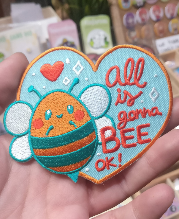 Parche bordado de tela con un diseño propio original de una abeja kawaii y el texto “All is gonna BEE ok”. Los parches de este estilo están super de moda por lo que es un regalo genial para cualquier coleccionista. Perfectos para decorar tu chaqueta, tu tote bag o simplemente coleccionar en un corcho.