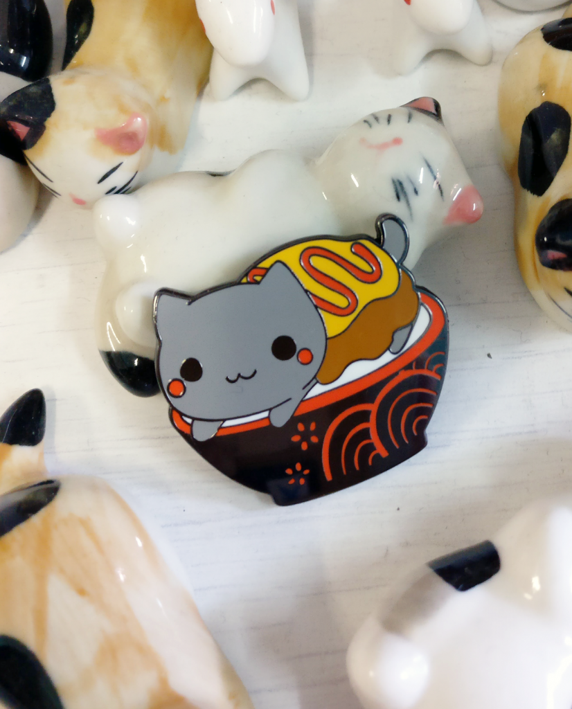 Pin de enamel de gato en un bol de Katsudon, con diseño propio. Los pins de enamel o lapel pins están super de moda por lo que es un regalo genial para cualquier coleccionista. Perfectos para decorar tu chaqueta, tu tote bag o simplemente coleccionar en un corcho.