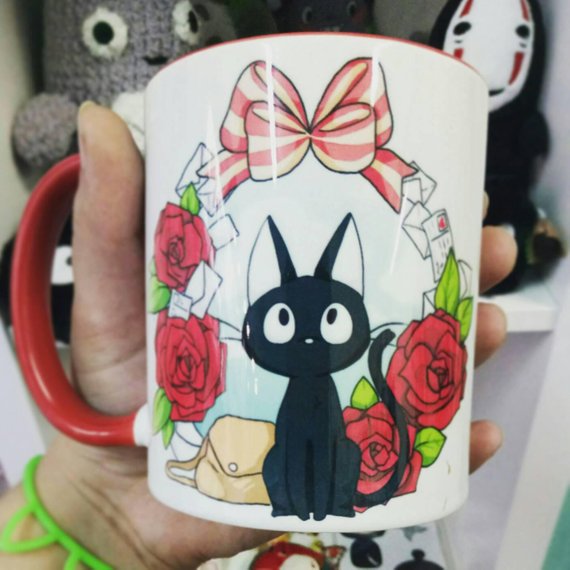 Una taza original para los amantes de las películas de Ghibli, en concreto “Kiki’s delivery service” que llegó a España como “Nicky aprendiz de bruja” .