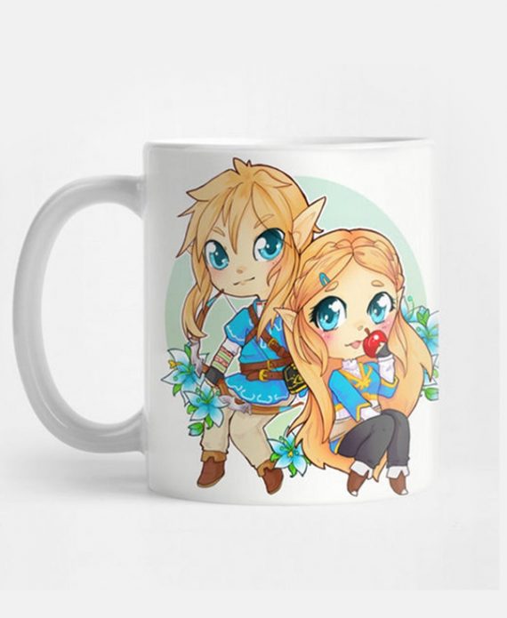 Una taza original para los amantes de “The legend of Zelda”, con un dibujo de Link y Zelda de la última entrega, Breath of the Wild, en chibi,